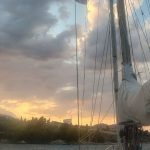 Anche oggi lasciamo gli ormeggi alle 5. Dobbiamo fare 62 miglia, l’ultima parte pare con vento fortino contro, quindi bisogna muoversi per tempo per arrivare prima del buio. La destinazione è Cirò. Il tempo è bello, l’alba nasce alle nostre spalle infuocando il cielo di rosso vivo e, cosa impensabile, sul mare si ergono nere