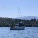 Verso le dieci e tre quarti accendiamo il motore e lasciamo gli ormeggi, circumnavighiamo Trizonia sul lato Nord e ci dirigiamo verso Lepanto. Lasciata l’isola alle nostre spalle, compare un po’ d’aria, apriamo le vele e tentiamo di navigare con quelle, ma non c’è sufficiente potenza e dopo poco dobbiamo ritornare al motore. Procediamo così