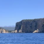 Alle 5 (ora greca) liberiamo gli ormeggi e nel buio ci mettiamo in rotta per Leuca. L’aria è fresca e il ponte bagnato di “guazza”, ma siamo ben coperti. C’è ancora mare lungo, ma un po’ meno fastidioso di ieri. Si va a motore, ovviamente, un po’ di vento propizio le previsioni lo danno per